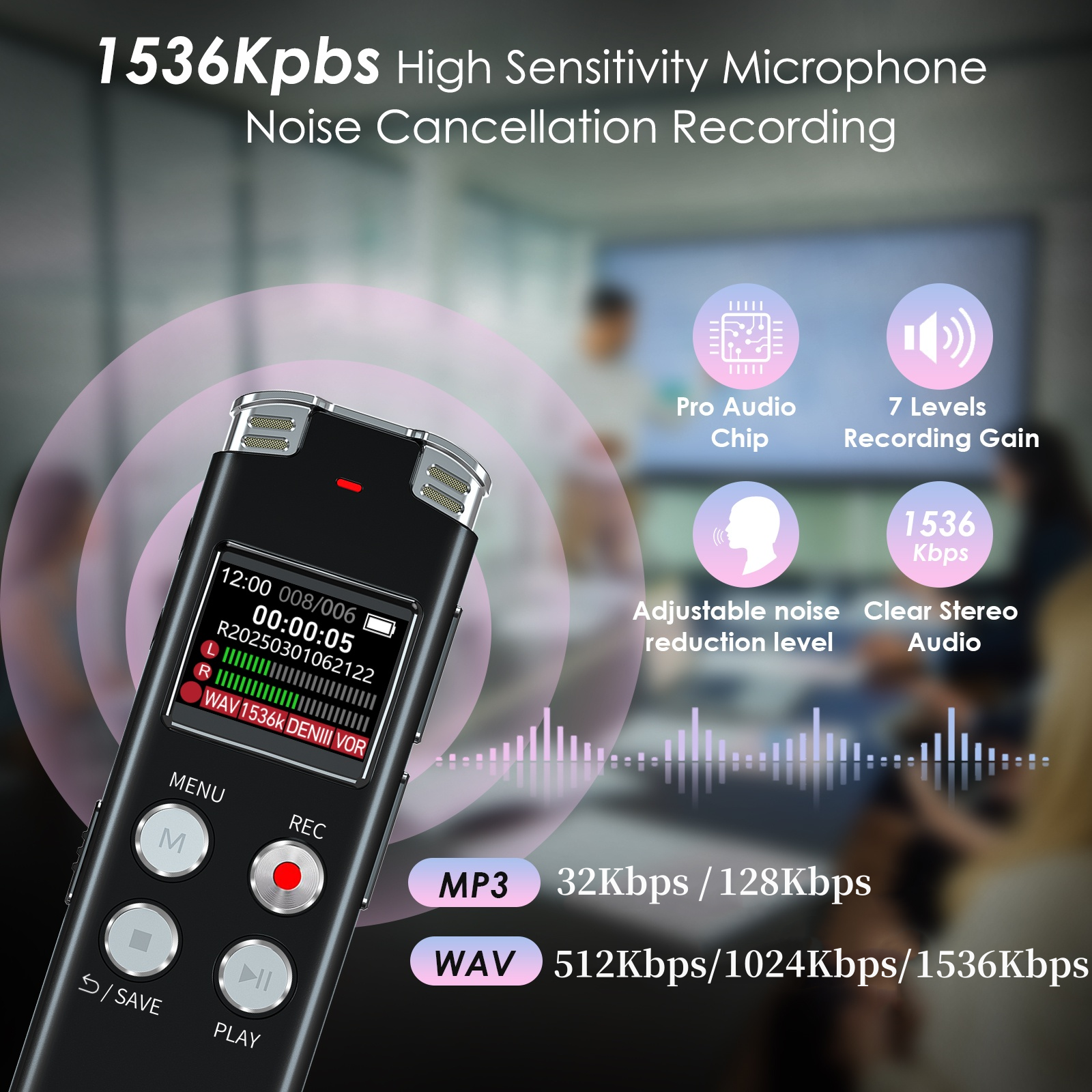 Enable AVR voice activation function, adjust 7 levels of voice control sensitivity, recorder for lectures only when the teacher is talking, capture human voice clearly and accurately, and won't let you miss any important details of the conversation. And the recorder will stop recording when no one is talking, reducing silent segments, saving your playback time and disk space, widely used in classrooms, meetings, interviews, lectures, and other occasions