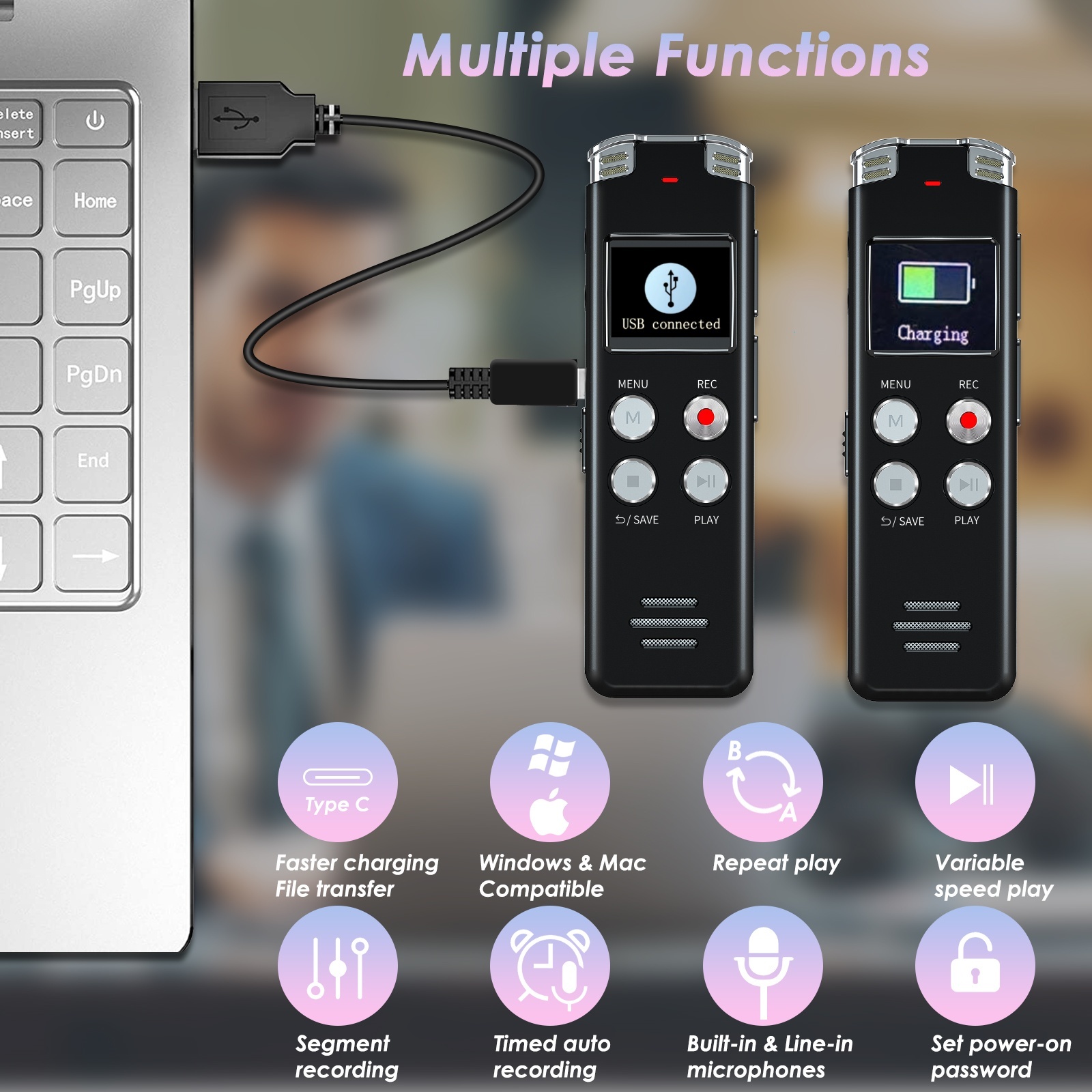 2.64GB High Capacity: L357 small audio recorder can store up to 4660 hours of recording files (32Kbps); configured with 500mAh battery and Type-C USB cable,3 hours fully charged for 32 hours of continuous recording and 35 hours of continuous playback.