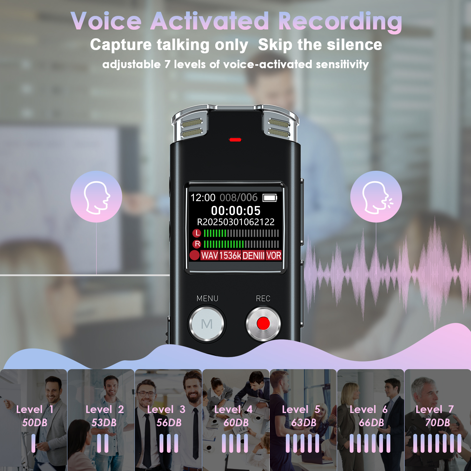 3.Voice Activated Recorder: Enable AVR voice activation function, adjust 7 levels of voice control sensitivity,and the recorder will stop recording when no one is talking, saving your playback time and disk space.